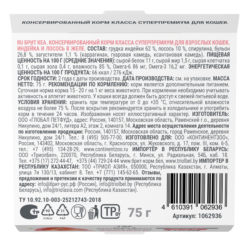 Вся линейка паучей и ламиcтеров Брит Кеа "Волокна в желе" построена на индейке как основном белке, с добавками разных морепродуктов. Это уникальная фишка линейки — моно-белковый состав на базе индейки + сочные волокна и желе, обогащенные спирулиной и таурином, создающие функциональное лакомство для взрослых кошек и котят. Сочетание диетической индейки с жирными кислотами из лосося помогает сохранить здоровье кожи и яркость шерсти. Особенности: поддержка сердечно-сосудистой системы; DHA и EPA из лосося; спирулина — природный источник витаминов группы B и хлорофилла; вкусно и полезно — без сои и злаков.