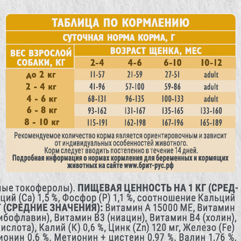 Рекомендации к кормлению: от 11 г до 191 г в сутки в зависимости от веса, комплекции и возраста животного.