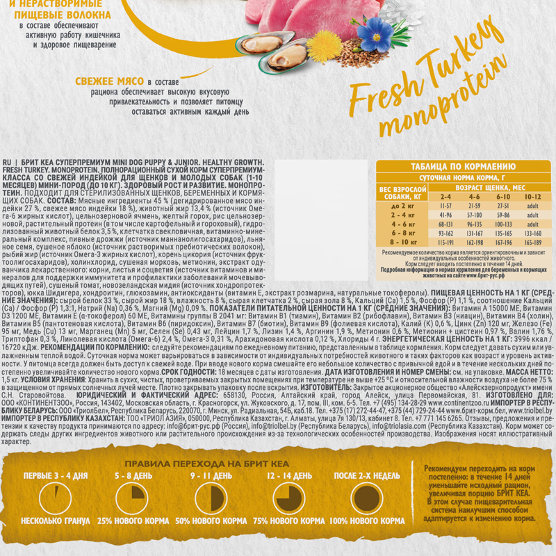 Брит Кеа Суперпремиум Mini Dog Puppy & Junior. Healthy Growth. Fresh Turkey Monoprotein. Полнорационный сухой корм суперпремиум-класса со свежей индейкой для щенков и молодых собак (1-10 месяцев) мини-пород пород (до 10 кг). Здоровый рост и развитие. Монопротеин. Подходит для беременных и кормящих собак.