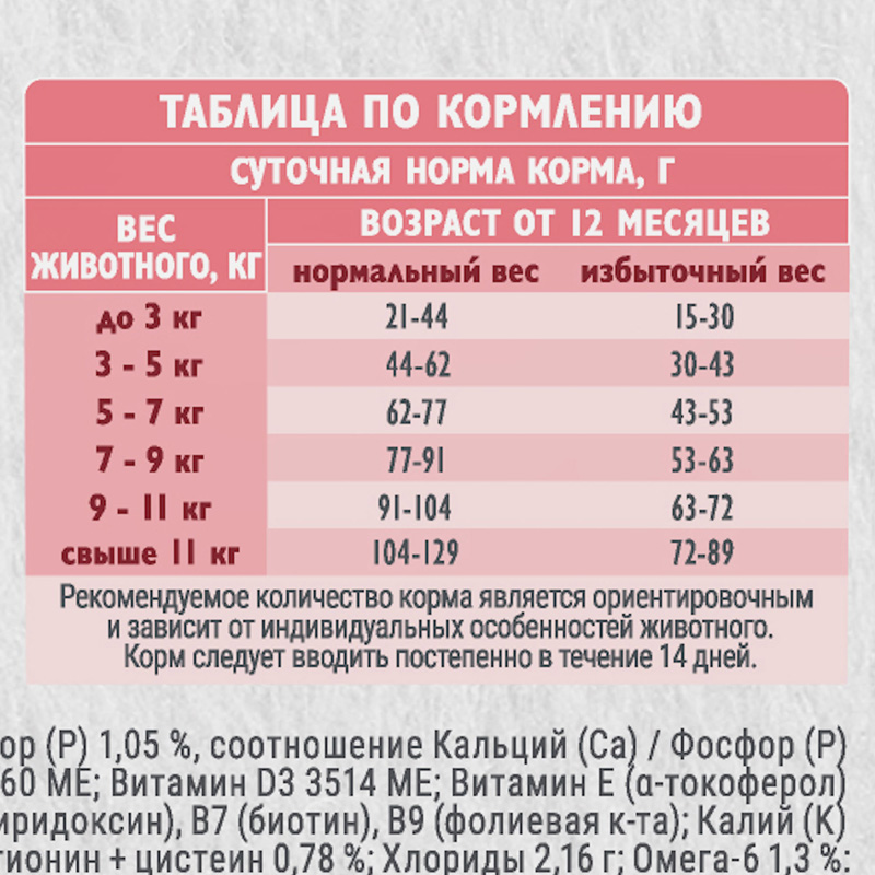Рекомендации к кормлению: от 21 г до 129 г в сутки в зависимости от веса, комплекции и возраста животного.