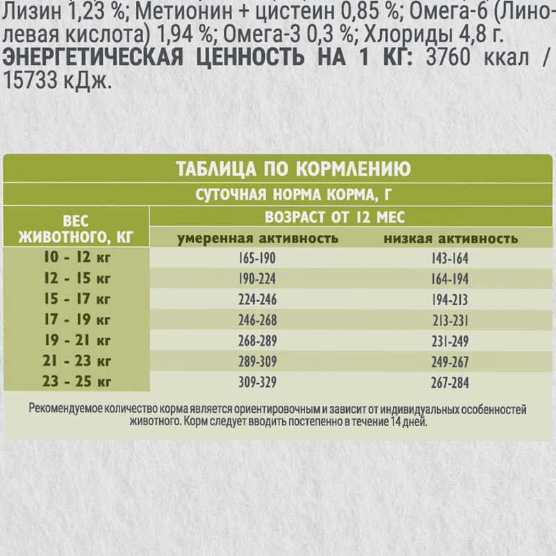 Рекомендации к кормлению: от 143 г до 329 г в сутки в зависимости от веса, комплекции и возраста животного.