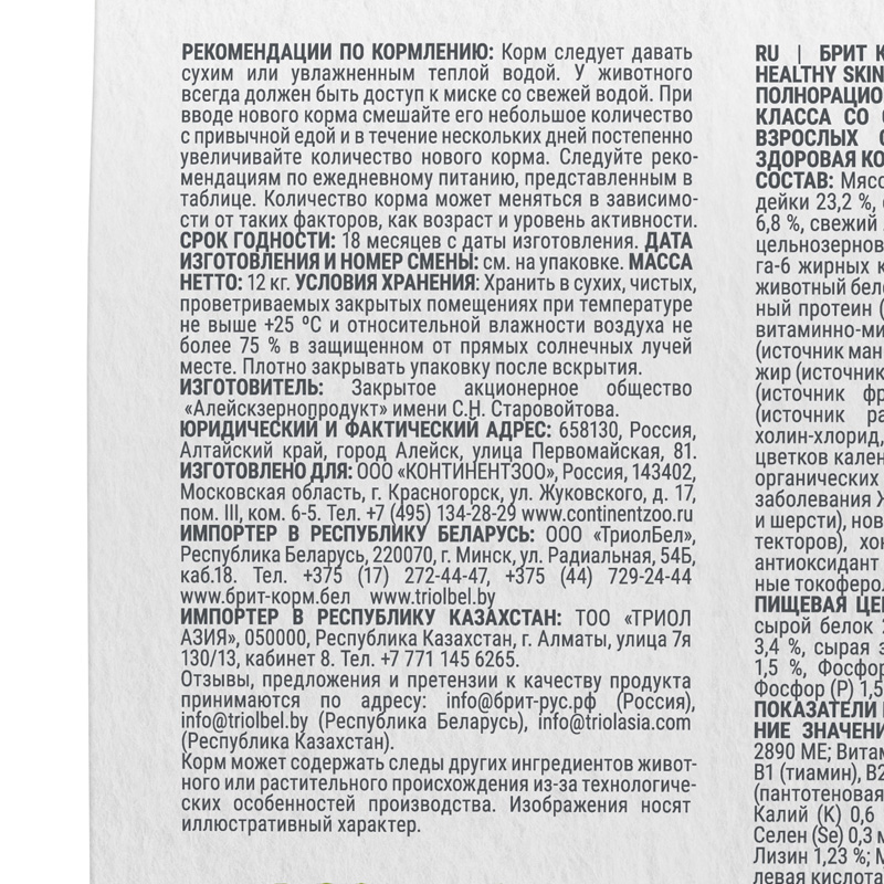 Состав: Мясо и рыба 40 % (дегидрированное мясо индейки 23,2 %, свежая рыба 6 %, дегидрированная рыба 6,8 %, свежий лосось 4 %), ячмень цельнозерновой, рис цельнозерновой, животный жир 10,3 % (источник Омега-6 жирных кислот), желтый горох, гидролизованный животный белок 3 %, клетчатка свекловичная, растительный протеин (в том числе картофельный и гороховый), витаминно-минеральный комплекс, пивные дрожжи (источник маннанолигосахаридов), льняное семя, рыбий жир (источник Омега-3 жирных кислот), корень цикория (источник фруктоолигосахаридов), сушеное яблоко (источник растворимых пребиотических волокон), холин-хлорид, сушеная морковь, DL-метионин, экстракт цветков календулы лекарственной (источник каротина, органических кислот и витаминов, профилактирующих заболевания ЖКТ и стимулирующих регенерацию кожи и шерсти), новозеландская мидия (источник хондропротекторов), хондроитин, глюкозамин, юкка Шидигера, антиоксидант (витамин Е, экстракт розмарина, натуральные токоферолы).