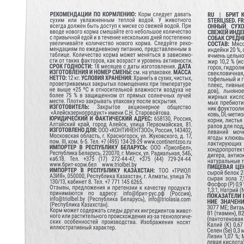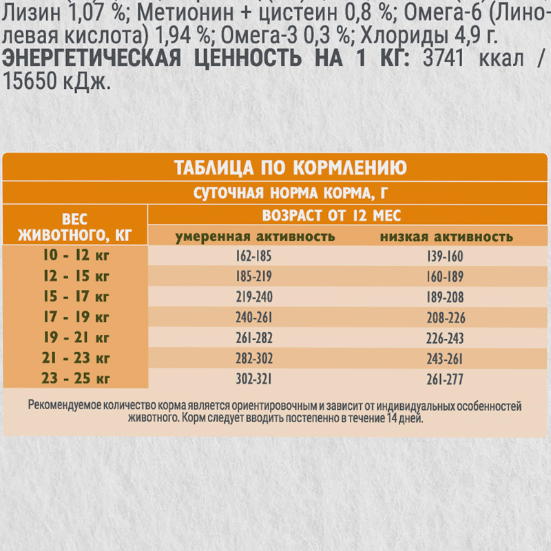 Состав: Мясо индейки 41 % (дегидрированное мясо индейки 20 %, свежее мясо и субпродукты индейки 21 %), ячмень цельнозерновой, рис цельнозерновой, животный жир 10,2 % (источник Омега-6 жирных кислот), желтый горох, гидролизованный животный белок 3 %, клетчатка свекловичная, растительный протеин (в том числе картофельный и гороховый), витаминно-минеральный комплекс, пивные дрожжи (источник маннанолигосахаридов), льняное семя, рыбий жир (источник Омега-3 жирных кислот), сушеное яблоко (источник растворимых пребиотических волокон), корень цикория (источник фруктоолигосахаридов), холин-хлорид, сушеная морковь, DL-метионин, экстракт одуванчика лекарственного: корни, листья и соцветия (источник витаминов и минералов для поддержки иммунитета и профилактики заболеваний мочевыводящих путей), сублимированные ягоды клюквы (источник органических кислот, профилактирующих МКБ), новозеландская мидия (источник хондропротекторов), хондроитин, глюкозамин, юкка Шидигера, антиоксидант (витамин Е, экстракт розмарина, натуральные токоферолы).