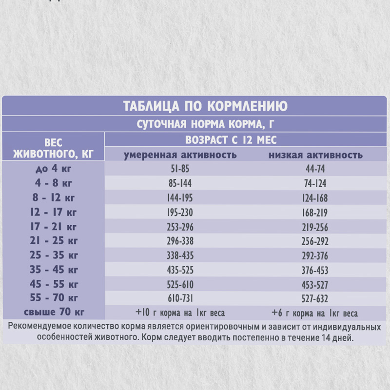 Рекомендации к кормлению: от 44 г до 731 г в сутки в зависимости от веса, комплекции и возраста животного.