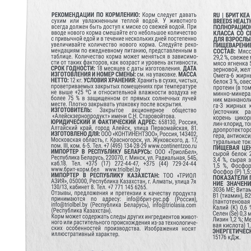 Брит Кеа Сухой корм для взрослых собак всех пород с индейкой, ягненком и рисом Dog Adult Sensitive Healthy Digestion, 1,5 кг