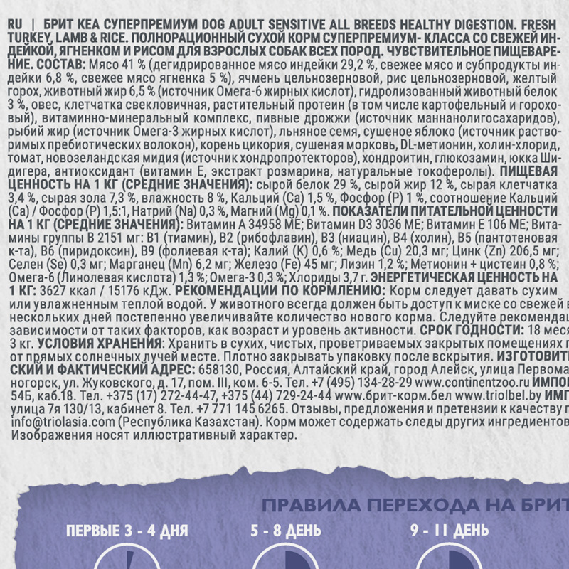 Брит Кеа Сухой корм для взрослых собак всех пород с индейкой, ягненком и рисом Dog Adult Sensitive Healthy Digestion, 3 кг