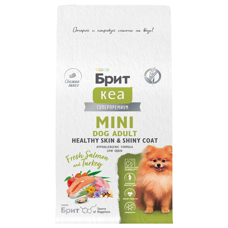 Брит Кеа Суперпремиум Mini Dog Adult. Healthy Skin & Shiny Coat. Fresh Salmon & Turkey. Полнорационный сухой корм суперпремиум-класса со свежим лососем и индейкой для взрослых собак мини-пород (до 10 кг). Здоровая кожа и шерсть.