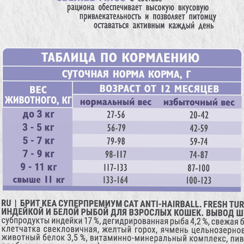 Рекомендации к кормлению: от 27 г до 164 г в сутки в зависимости от веса, комплекции и возраста животного.