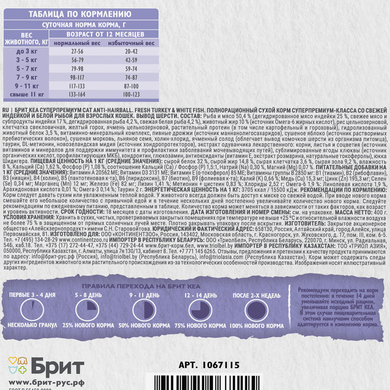 Брит Кеа Сухой корм для взрослых кошек с индейкой и белой рыбой Anti-Hairball, 400 г