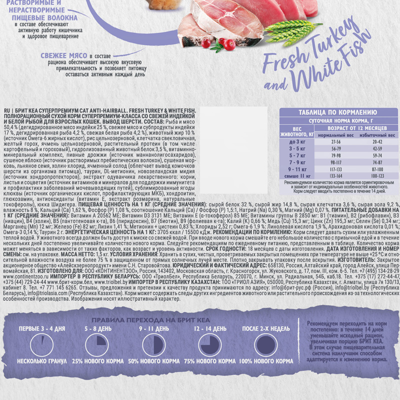 Брит Кеа Сухой корм для взрослых кошек с индейкой и белой рыбой Anti-Hairball, 1,5 кг
