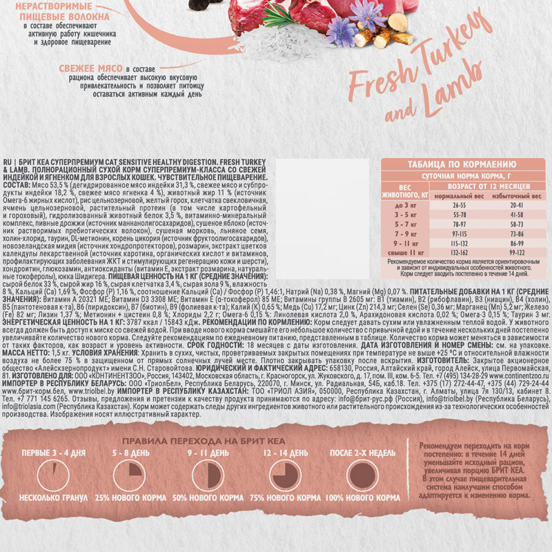 Брит Кеа Сухой корм для взрослых кошек с индейкой и ягненком Sensitive Healthy Digestion, 1,5 кг