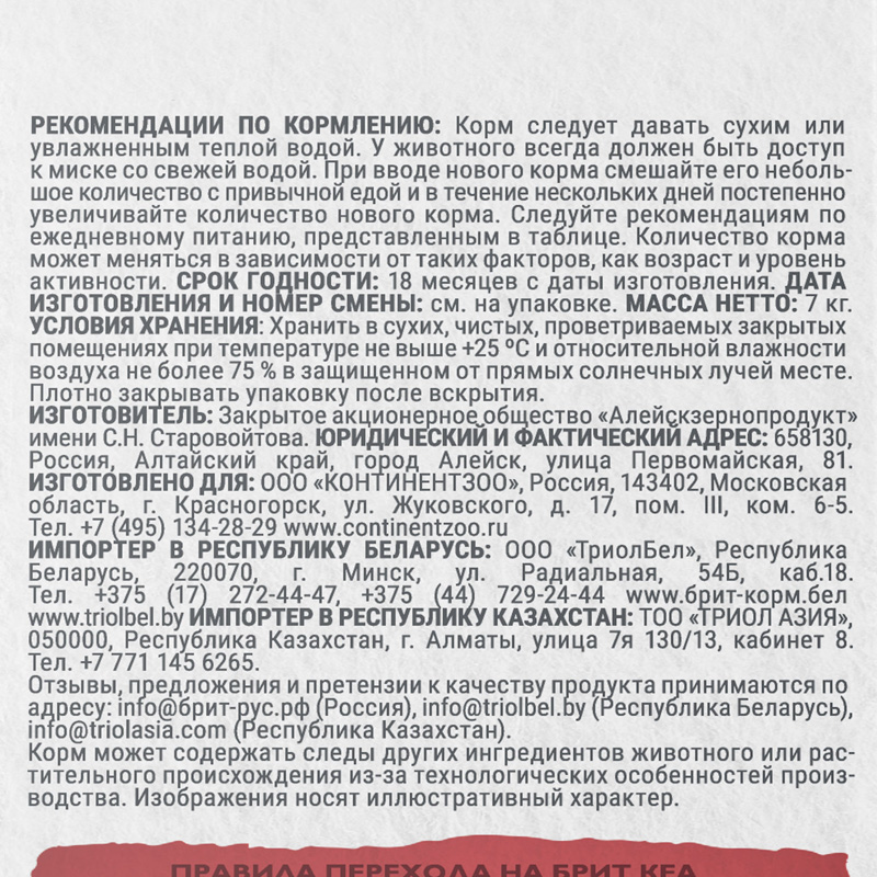 Состав: Мясо птицы 49,2 % (дегидрированное мясо индейки 26,7 %, свежее мясо и субпродукты индейки 18,3 %, свежее мясо утки 4,2 %), животный жир 10 % (источник Омега-6 жирных кислот), рис цельнозерновой, желтый горох, клетчатка свекловичная, ячмень цельнозерновой, растительный протеин (в том числе картофельный и гороховый), гидролизованный животный белок 3,5 %, витаминно-минеральный комплекс, пивные дрожжи (источник маннанолигосахаридов), сушеное яблоко (источник растворимых пребиотических волокон), сушеная морковь, льняное семя, холин-хлорид, таурин, DL-метионин, корень цикория (источник фруктоолигосахаридов), новозеландская мидия (источник хондропротекторов), экстракт одуванчика лекарственного: корни, листья и соцветия (источник витаминов и минералов для поддержки иммунитета и профилактики заболеваний мочевыводящих путей), сублимированные ягоды клюквы (источник органических кислот, профилактирующих МКБ), хондроитин, глюкозамин, антиоксиданты (витамин Е, экстракт розмарина, натуральные токоферолы), юкка Шидигера.