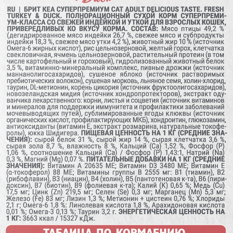 Сухой корм Брит Кеа с индейкой и уткой для привередливых кошек разработан для удовлетворения потребностей взрослых кошек, отличающихся избирательностью в питании. Его уникальная формула сочетает в себе вкусные и легкоусвояемые источники белка — индейку и утку, что делает корм не только питательным, но и привлекательным для привередливых питомцев.