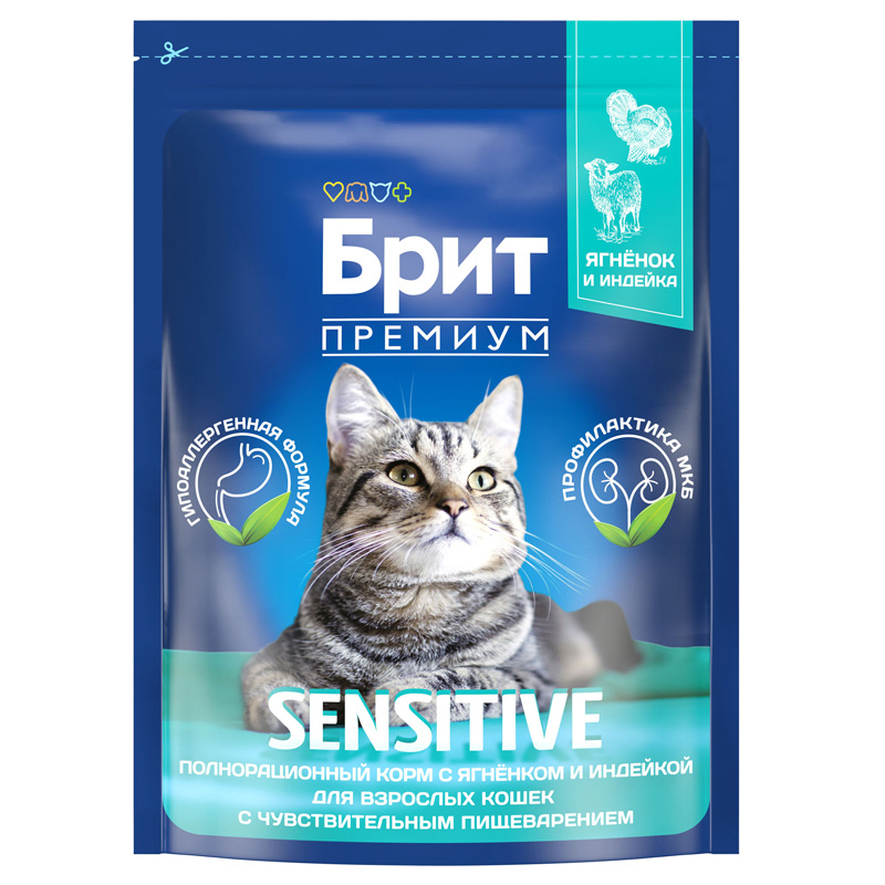 Брит Премиум Сухой корм для взрослых кошек с чувствительным пищеварением с ягненком и индейкой Cat Sensitive, 2 кг