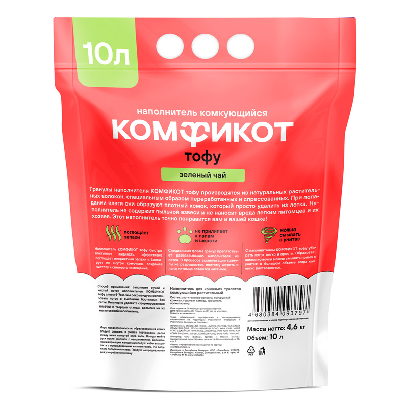 Наполнитель КОМФИКОТ тофу быстро впитывает жидкость, эффективно поглощает неприятные запахи и блокирует их внутри комочков, сохраняя чистоту и свежесть помещения. Специальная форма гранул препятствует разбрасыванию наполнителя из лотка. В процессе эксплуатации гранулы не разрушаются, поэтому шерсть и лапы питомца остаются чистыми. С наполнителем КОМФИКОТ тофу убирать лоток легко и просто. Образовавшиеся комочки можно смывать прямо в унитаз: в большом объеме воды они легко растворяются. Способ применения: заполните сухой и чистый лоток наполнителем КОМФИКОТ тофу слоем 5-7 см. Мы рекомендуем использовать лоток с высокими бортиками без сетки. Регулярно удаляйте сформированные комочки и твердые отходы, досыпая на их место свежий наполнитель. Состав: растительные волокна, кукурузный крахмал, гуаровая камедь, краситель, ароматизатор. Масса нетто: 4,6 кг. Объем: 10 л.
