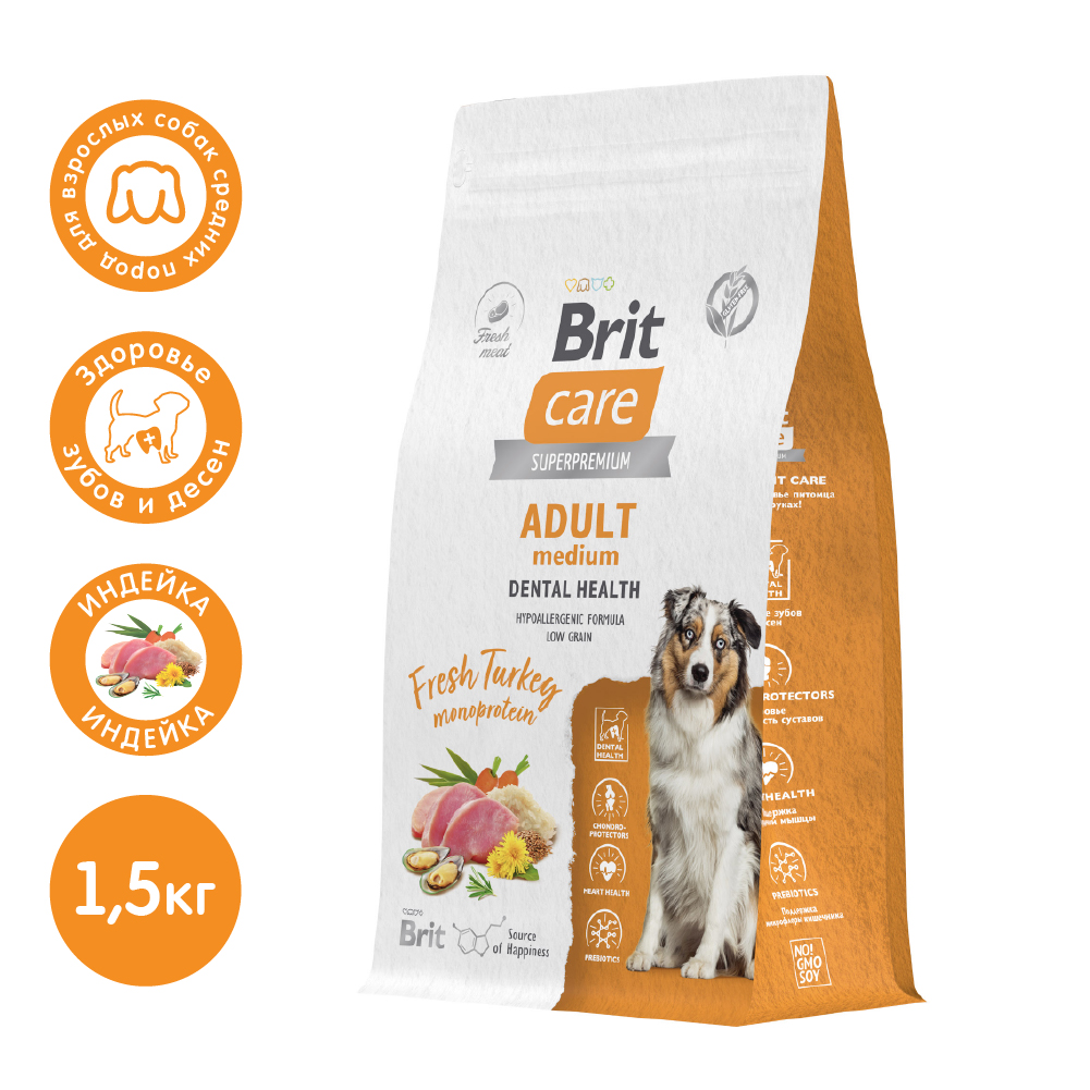 Брит Кеа Сухой корм для собак средних пород для здоровья зубов с индейкой Dog Adult M Dental Health, 1,5 кг