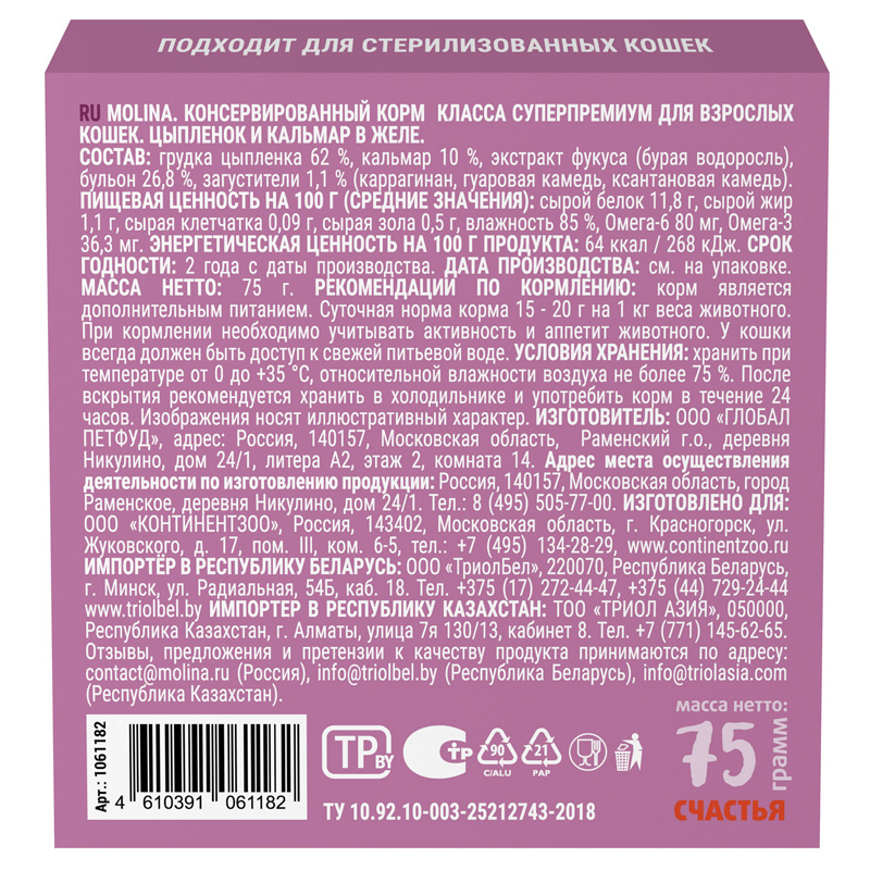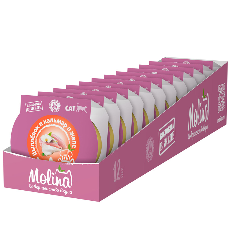 Molina Ламистер для взрослых кошек. Цыпленок и кальмар в желе