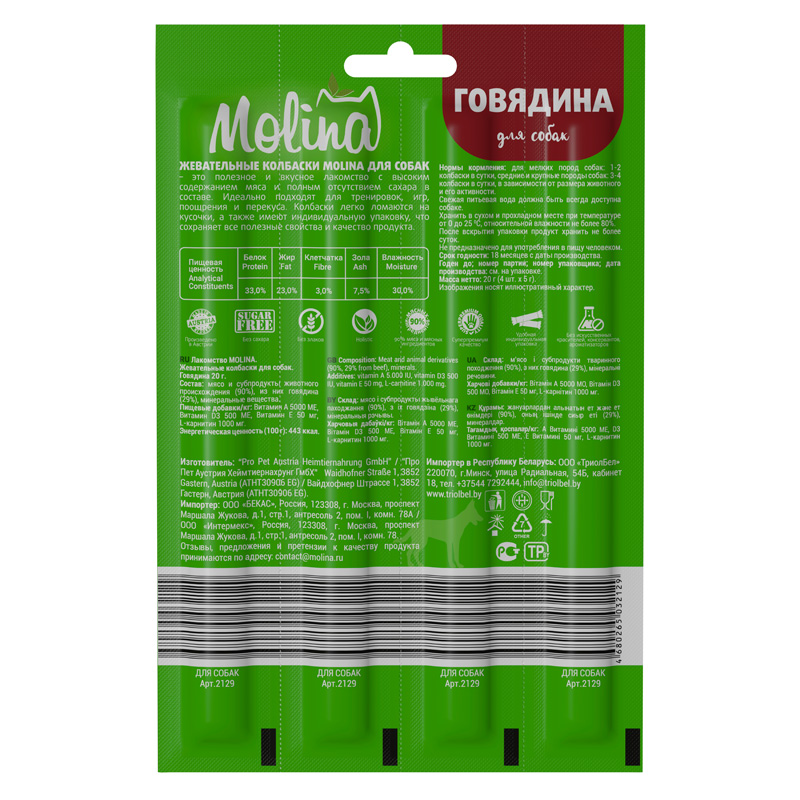Molina Жевательные колбаски д/собак из говядины, 29 г