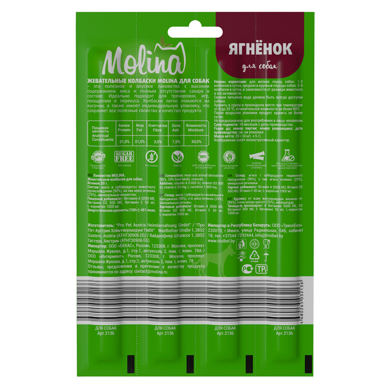 Molina Жевательные колбаски д/собак из ягнененка, 20 г