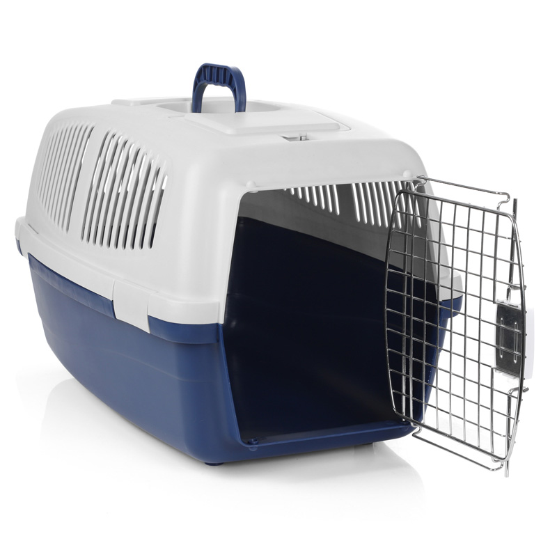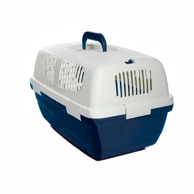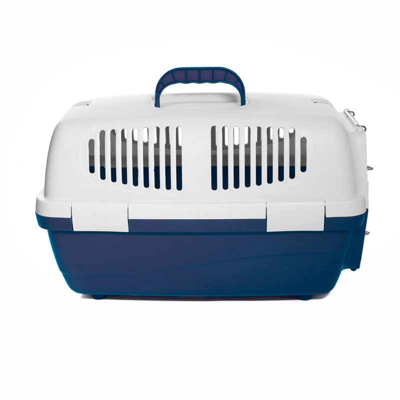 Переноска выполнена из прочного пластика. Оснащена вентиляционными окошками, металлической дверцей, надежным замком и удобной ручкой для транспортировки. Максимальная нагрузка: 3кг. Цвет: верх - молочный, низ - индиго. Размер: 480*290*280мм.